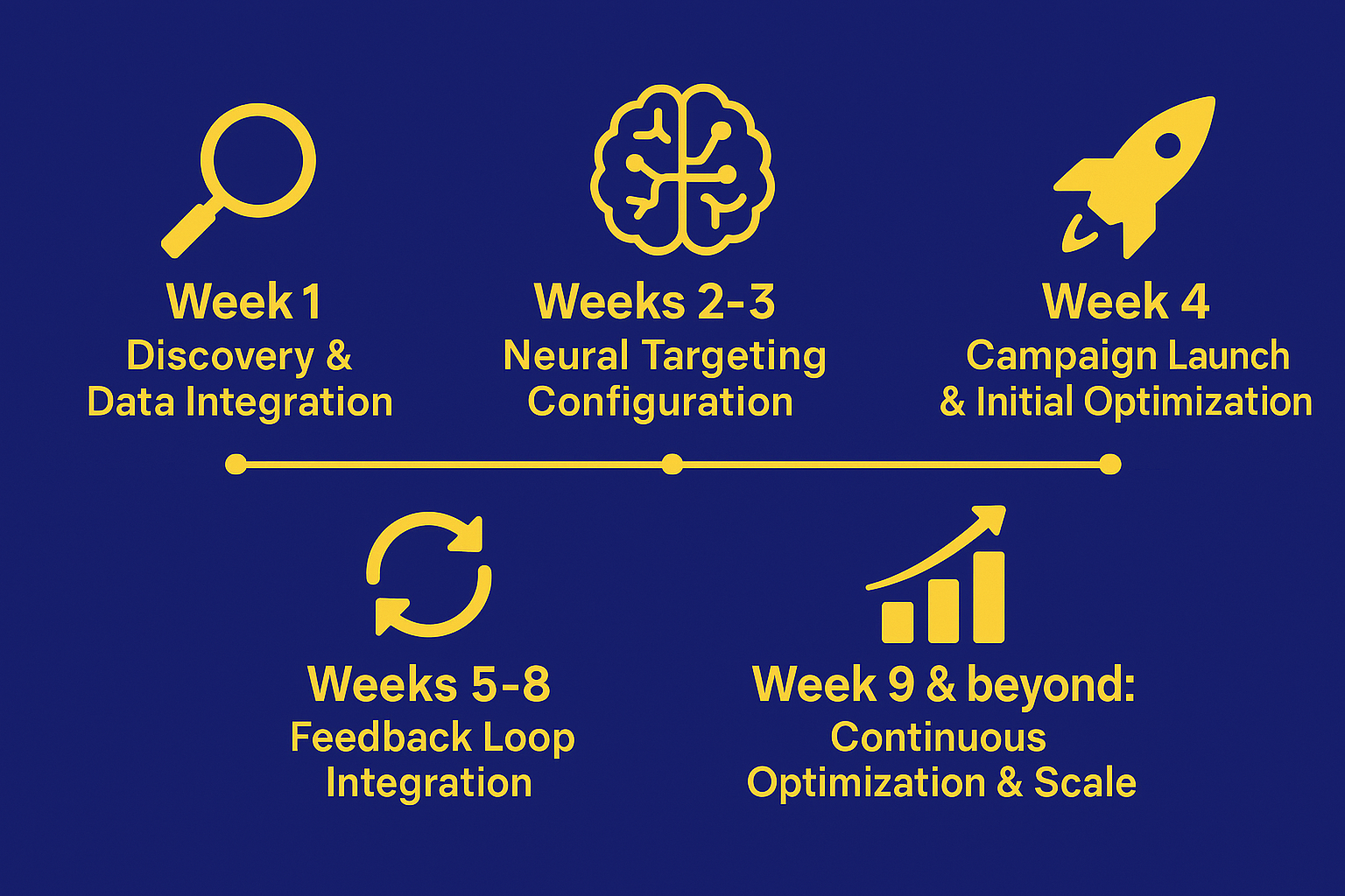 Weeks 2-3: Neural Targeting Configuration. We'll configure our Neural Targeting Engine with your ideal customer profile data and train it on your unique selling proposition to create a custom targeting algorithm.